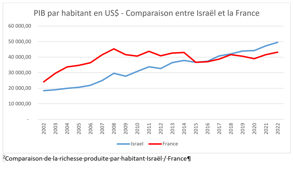 Une analyse sur les vingts dernières années du critère du PIB par habitant montre qu’Israël a dépassé la France en 2015 -2016. En 2021, la production de richesse par habitant[1] sera en Israël de 47 304 US$ alors qu’en France elle sera de 41 567 US$. L’écart a eu tendance à se creuser année après année, et les prévisions pour 2022 vont encore continuer à creuser l’écart.